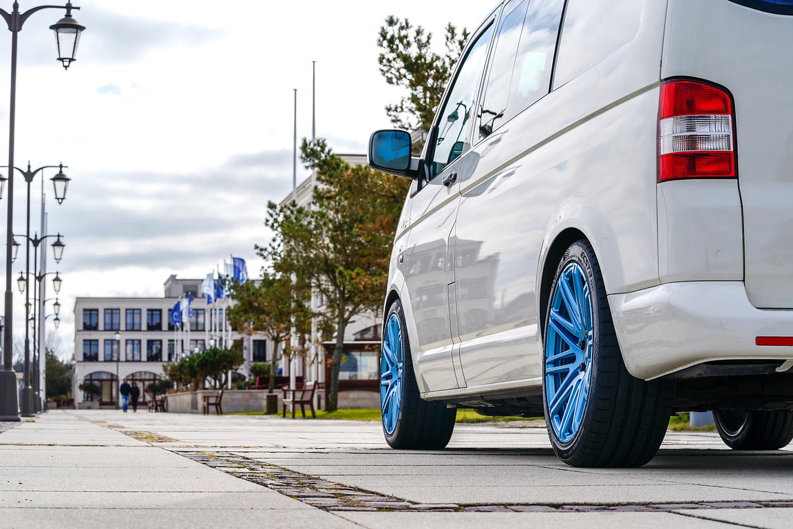 Diese Felgen wurden speziell für den VW T5 / VW T6 entwickelt. Die Radlast beträgt mindestens 865 kg – also perfekt für den Bus. Laut Gutachten wird ein Reifen in der Größe 275 / 35 20 (102) empfohlen. Auf Grund unserer Erfahrung haben wir uns wieder für die Reifengröße 255 / 40 20 (101) entschieden, da diese noch etwas mehr Komfort bietet. Das Rad muss dann per Einzelabnahme eingetragen werden. Auf der Fahrerseite haben wir die Felgen in einem Blau-matt lackieren lassen. Auf der Beifahrerseite wurden die Felgen original in Gunmetal belassen.