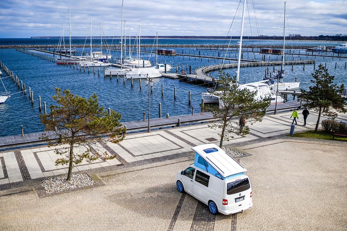 Aufstelldach / Schlafdach: Auf dem VW T5 montierten wir ein B4f Aufstelldach Basic mit MeerSicht Zeltbalg in der Sonderfarbe Skyblue. Neben unseren 10 Standartfarben können wir weitere 20 Sonderfarben bei uns vor Ort anbieten. Zusätzlich verbauten wir ein Glas-Hubdach und ein Airline-Schienen-System in schwarz, zur Dachgepäckträger-Aufnahme.