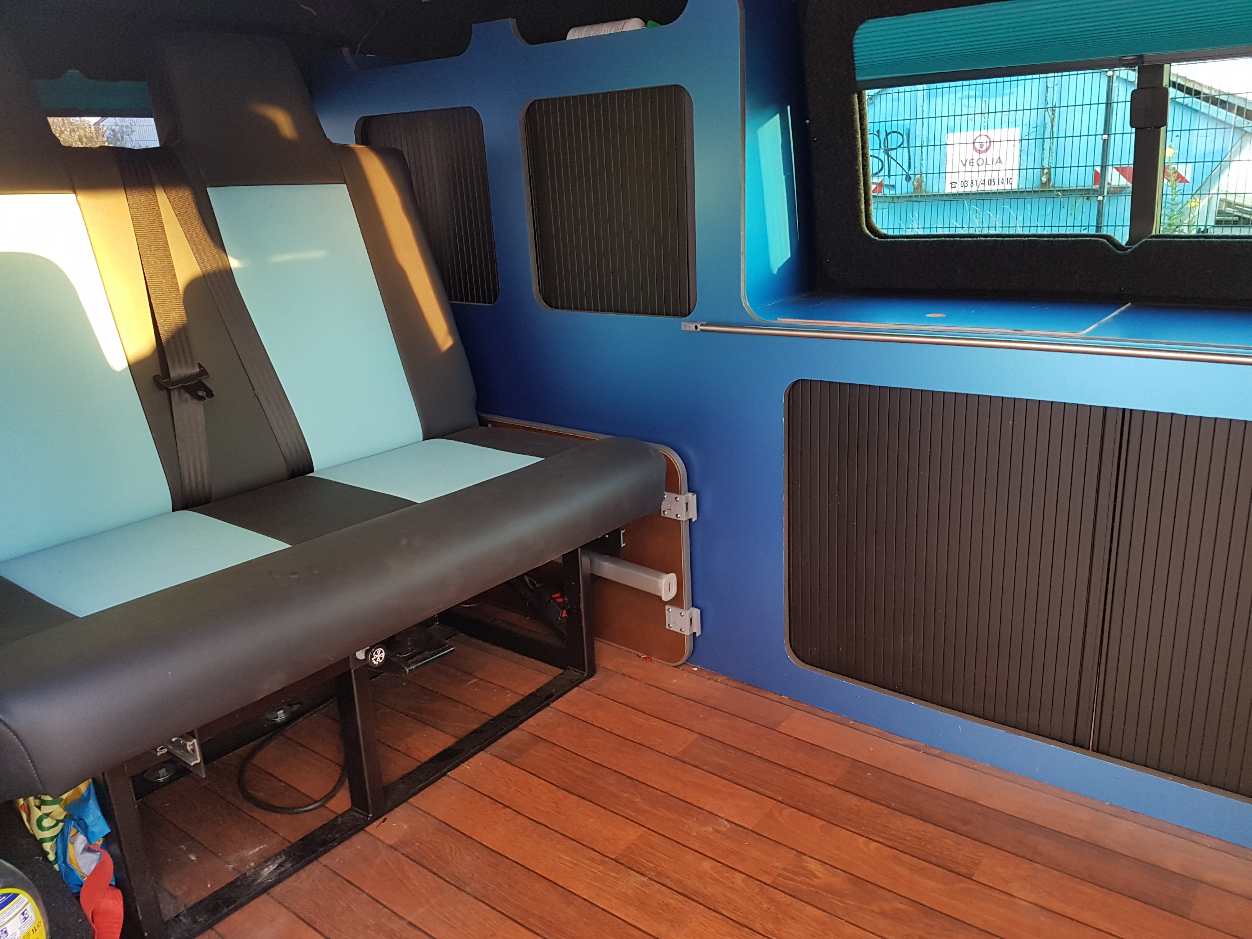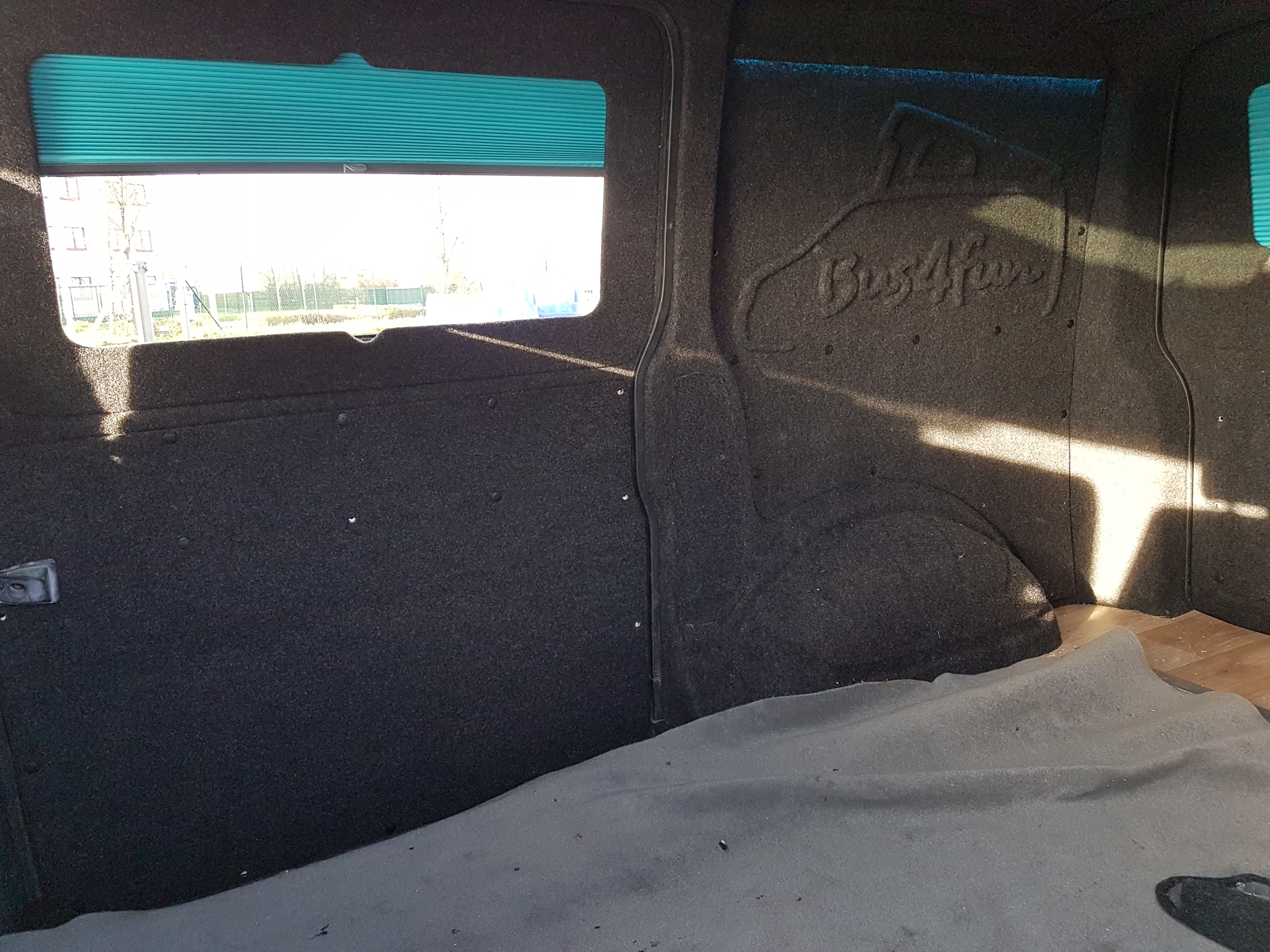 Innenausbau: Der Innenraum wurde mit B4f Carpet Filz und unserem Logo verkleidet. Weiterhin ist unsere Möbelzeile #Stylecamper Design 1 installiert worden. An den Fenstern wurden Windowpod – Jalousien montiert.